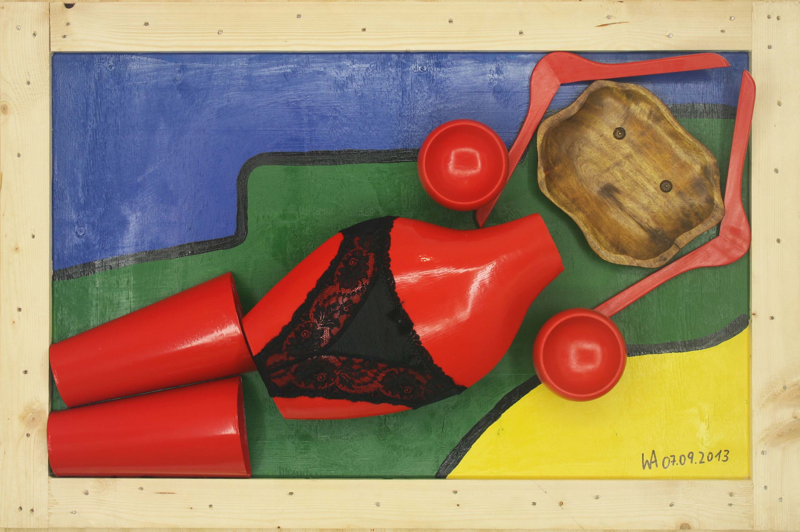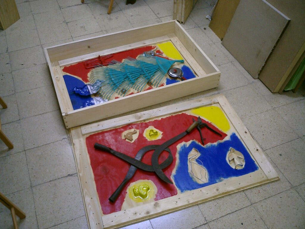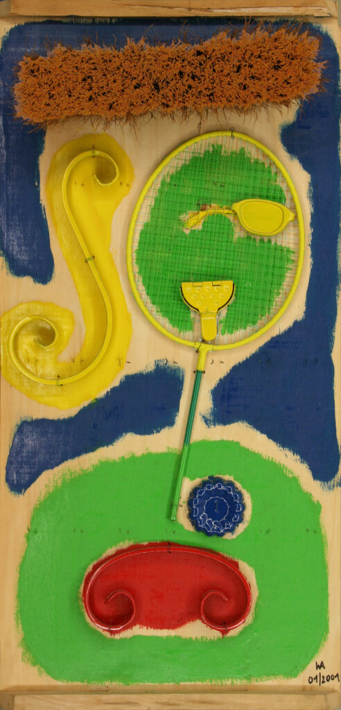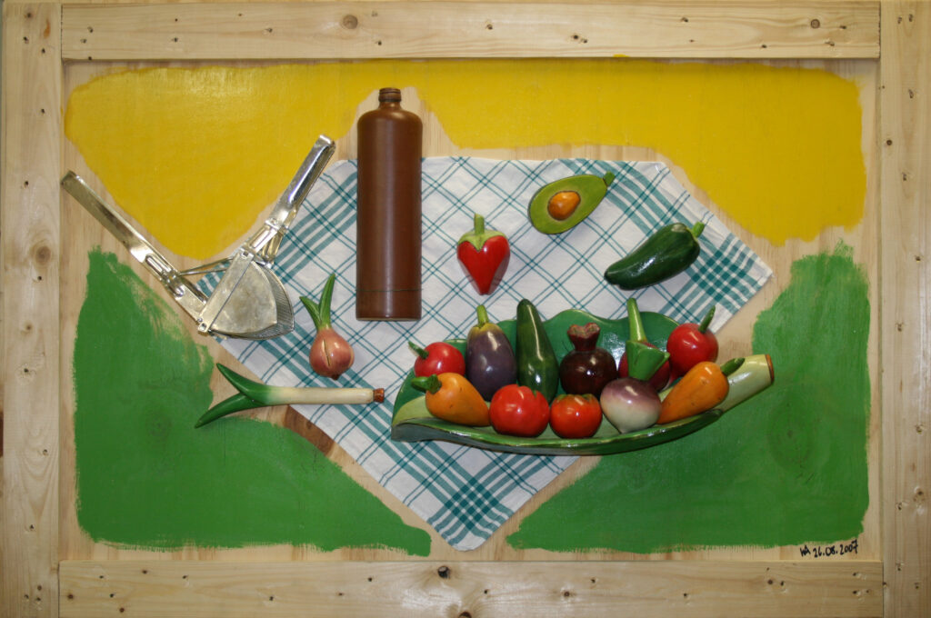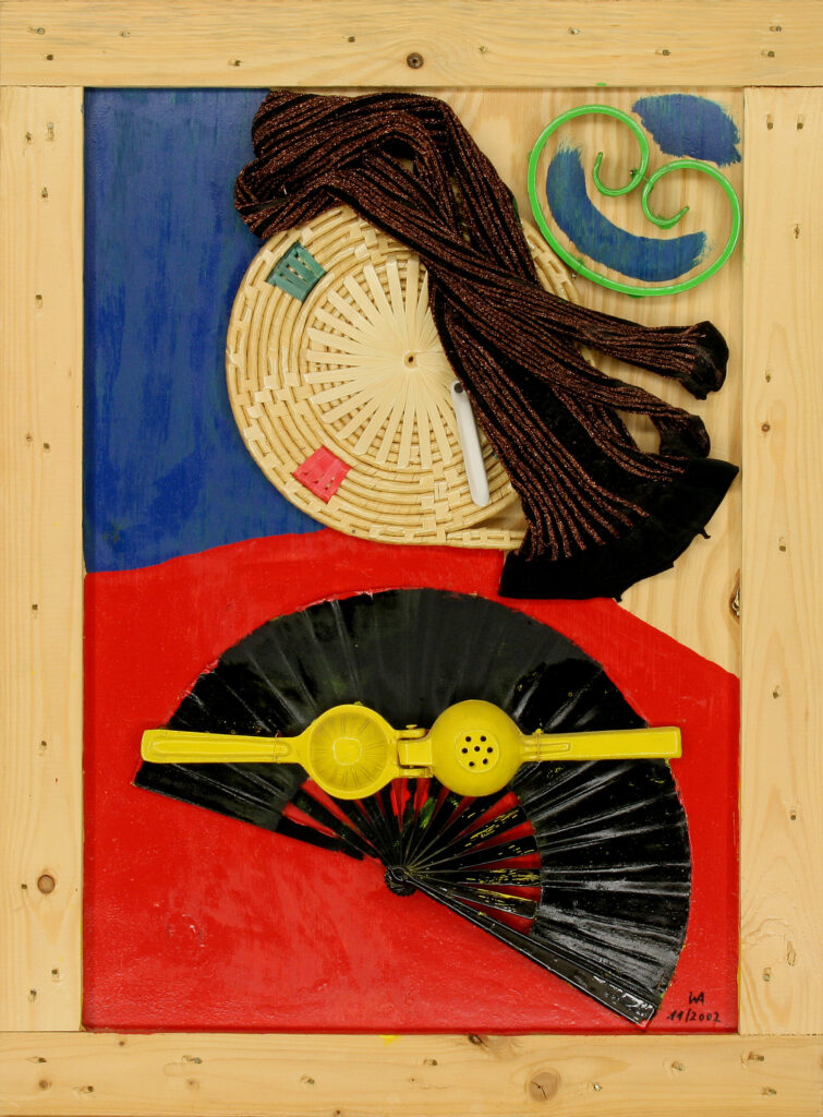 La realización de mis obras sobre tapaderas de cajas de transporte o bandejas de horno, en lugar de sobre finos lienzos, me ha producido especial placer. Las tapaderas de las cajas ofrecían la ventaja de poseer un marco interior de madera, que fijaba la tapadera a la caja, asegurando así su cierre. Con ello obtuve a la vez, tanto un soporte para los objetos que componen el cuadro, como un marco para el mismo. A veces pude aprovechar los agujeros propios de la madera para mis creaciones artísticas, como en la obra “Nuda”, en la que el agujero de la madera resultó ideal para representar el ombligo. La utilización en mis obras de objetos cotidianos, como por ejemplo, recogedores metálicos para relojes de cocina o ralladores de queso para lámparas, fue otra posibilidad de convertir objetos corrientes en arte. Una serie de 3 recogedores metálicos, dotados de los mecanismos de sendos relojes constituye, hoy nuestro “Reloj del mundo” y marca las horas de Tokio, Nueva York y, por supuesto, Madrid y Munich. Una serie de lámparas y relojes, realizados a partir de moldes de cocina, completó en 1994 este aprovechamiento de objetos. Incluso la escoba de la cocina se convirtió en un rostro (acorde con el pelo negro del cepillo con raya a un lado) y el soporte de la sombrilla, recibió un diseño tipo “Miró”.