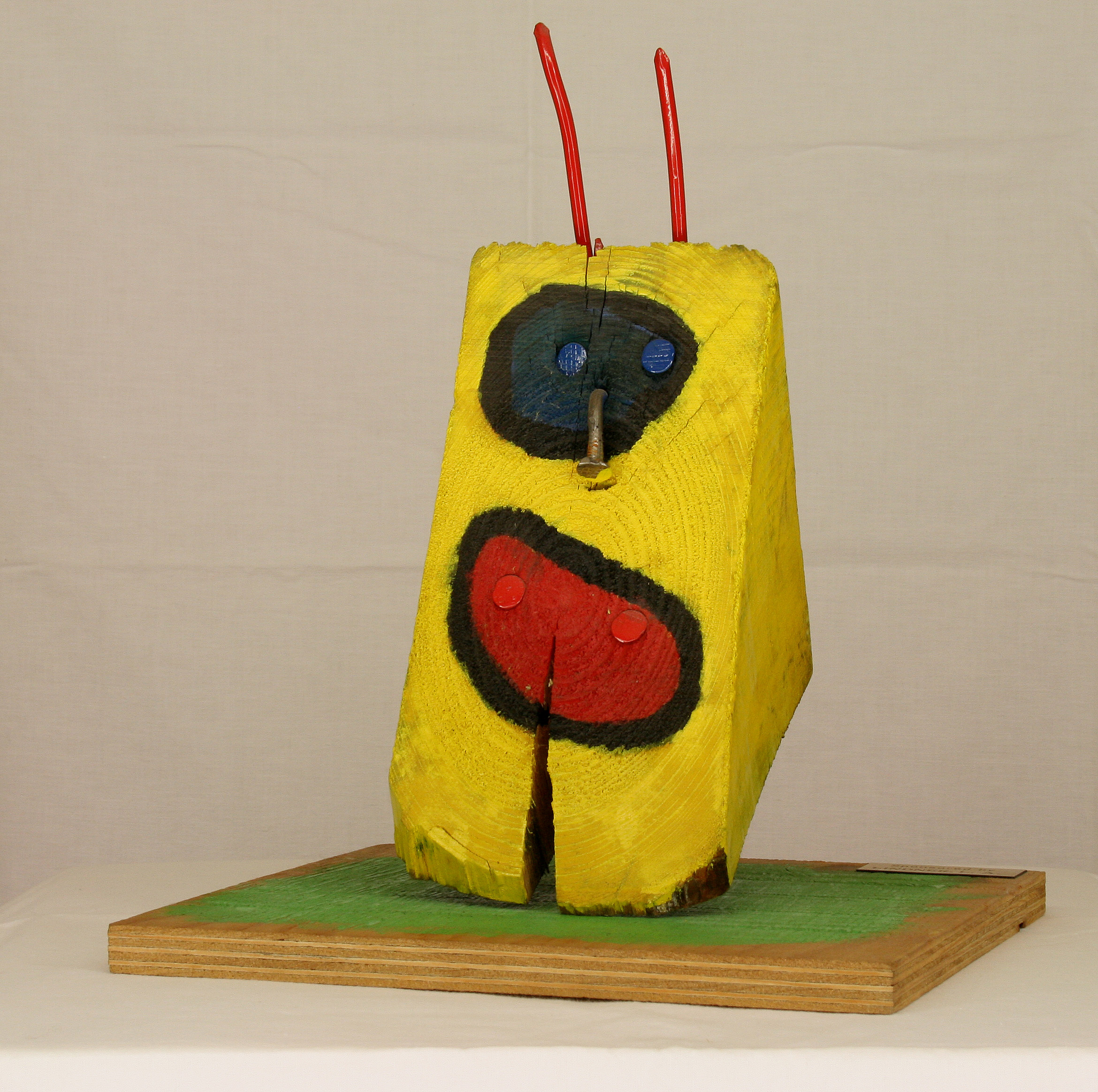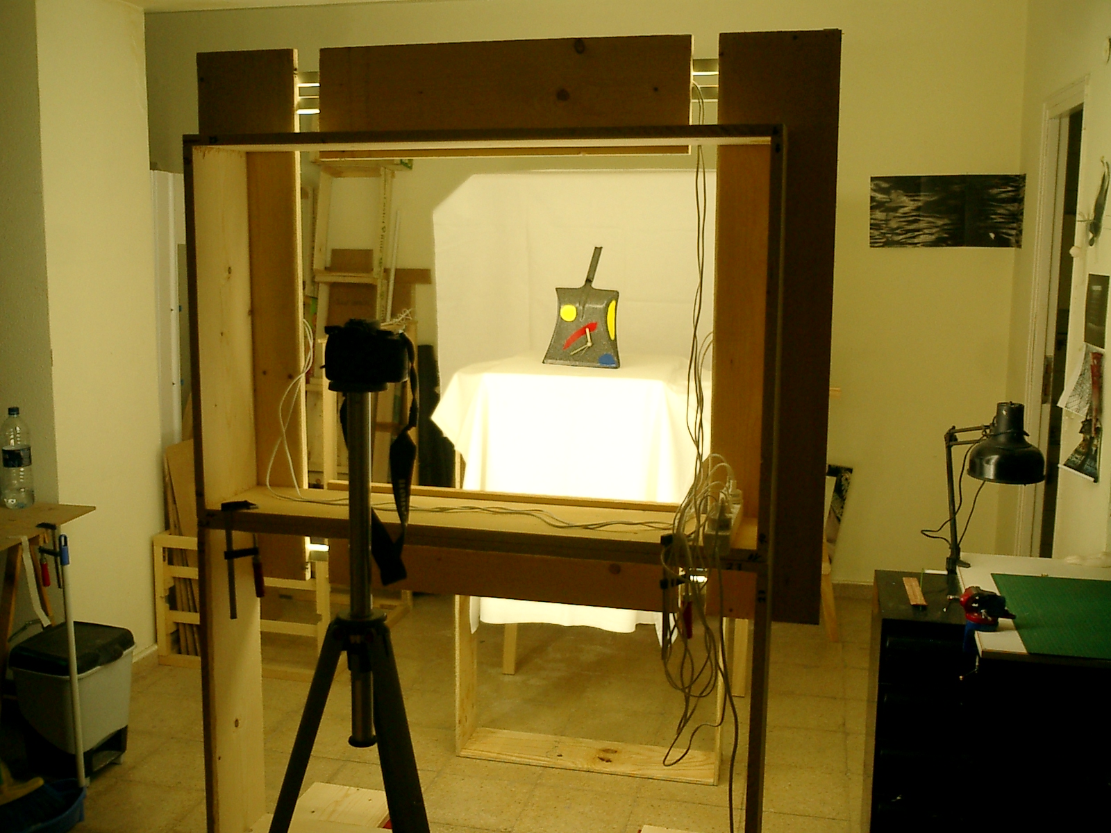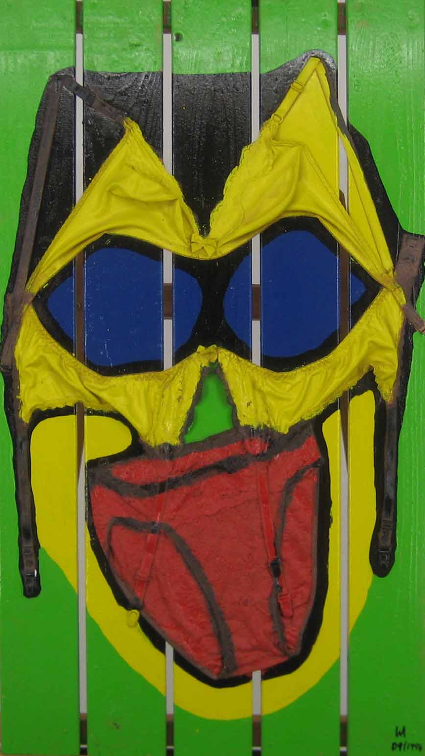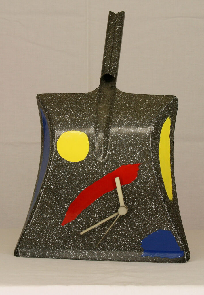La realización de mis obras sobre tapaderas de cajas de transporte o bandejas de horno, en lugar de sobre finos lienzos, me ha producido especial placer. Las tapaderas de las cajas ofrecían la ventaja de poseer un marco interior de madera, que fijaba la tapadera a la caja, asegurando así su cierre. Con ello obtuve a la vez, tanto un soporte para los objetos que componen el cuadro, como un marco para el mismo. A veces pude aprovechar los agujeros propios de la madera para mis creaciones artísticas, como en la obra “Nuda”, en la que el agujero de la madera resultó ideal para representar el ombligo. La utilización en mis obras de objetos cotidianos, como por ejemplo, recogedores metálicos para relojes de cocina o ralladores de queso para lámparas, fue otra posibilidad de convertir objetos corrientes en arte. Una serie de 3 recogedores metálicos, dotados de los mecanismos de sendos relojes constituye, hoy nuestro “Reloj del mundo” y marca las horas de Tokio, Nueva York y, por supuesto, Madrid y Munich. Una serie de lámparas y relojes, realizados a partir de moldes de cocina, completó en 1994 este aprovechamiento de objetos. Incluso la escoba de la cocina se convirtió en un rostro (acorde con el pelo negro del cepillo con raya a un lado) y el soporte de la sombrilla, recibió un diseño tipo “Miró”.
