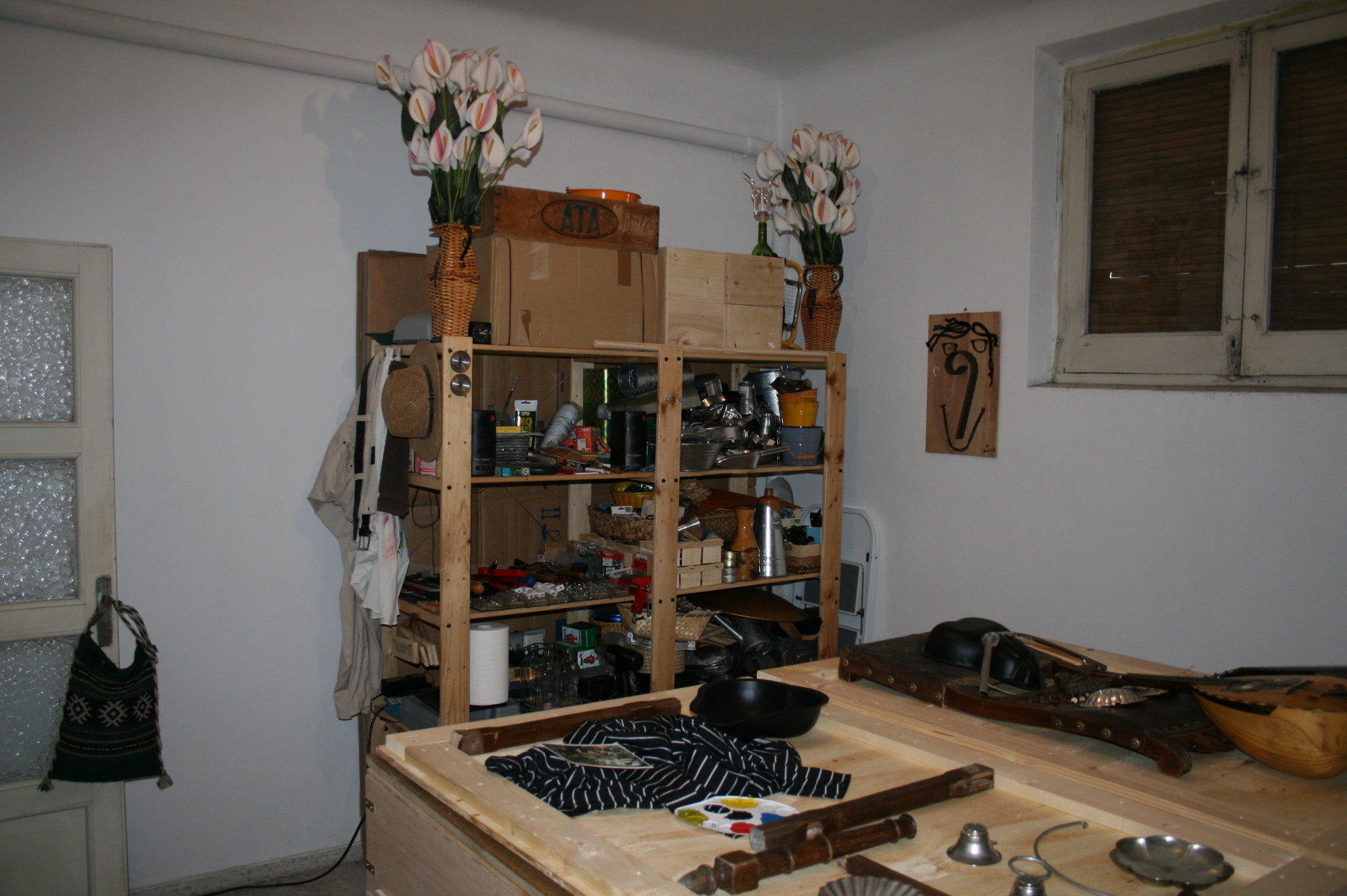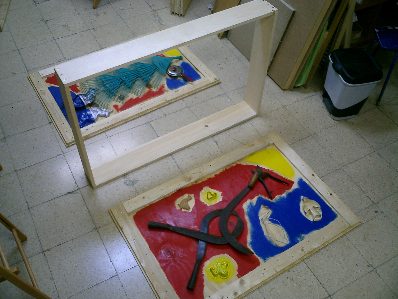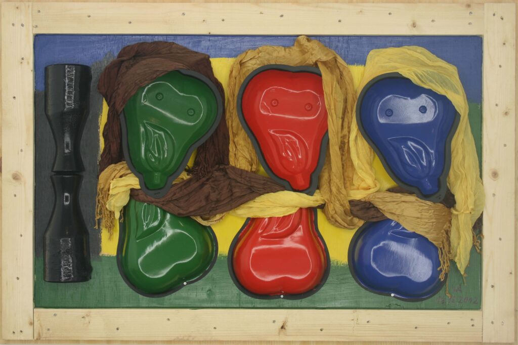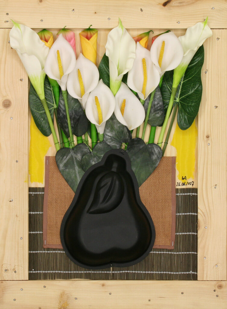 Usé las cajas de embalaje de jamón para “Hombre y Mujer”. Las cajas de vino y cava se convirtieron en obras de arte, e incluso la tapadera con el listón en medio, se transformó, junto con los dos grandes cubos, en “Pechos”. Al fin utilicé también el marco que había encontrado, cerca de nuestro piso, en la calle Viriato. Los talleres de marcos de esta calle se deshacen, a menudo, de marcos dañados, dejándolos en la calle. El estropeado marco fue perfecto para enmarcar el cuadro “Abuelo”. La pata de la cama, como bigote, y la manecilla de la ventana, como nariz, estaban en mi imaginación desde hacía ya tiempo. Y finalmente realicé la copia del cuadro de Diego Rivera “Mujer con calas” para el que ya tenía preparados los moldes en forma de pera, y las flores de plástico.