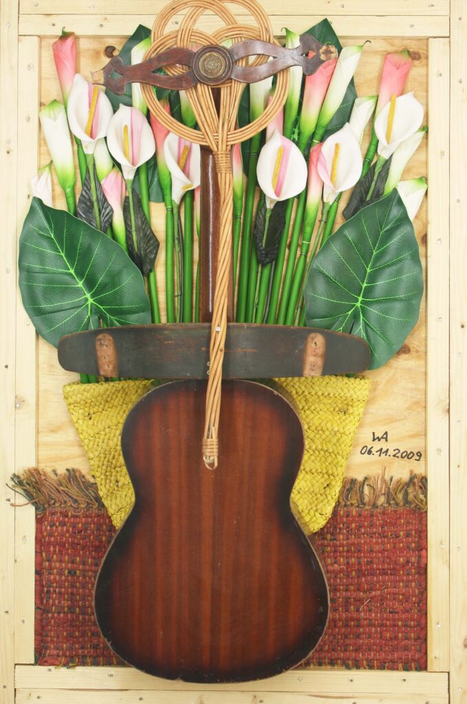 Con la guitarra que había encontrado hacía años en la basura pude reproducir otra obra de Diego Rivera: “Desnudo con alcatraces”, esta vez en formato grande de 120 x 80 cm. Esta obra y “Dos mujeres en la playa de Tahití”, de Paul Gauguin, fueron las primeras de mi proyecto “20 obras famosas”. Así nacieron también las interpretaciones de “Doce Girasoles”, de Vincent van Gogh, y de “Nenúfares” de Claude Monet. En este contexto también nacieron obras de estilo cubista como “Guitarra” de Georges Braque. Con “El artista y su modelo” he realizado un homenaje a mi gran ídolo Pablo Picasso.