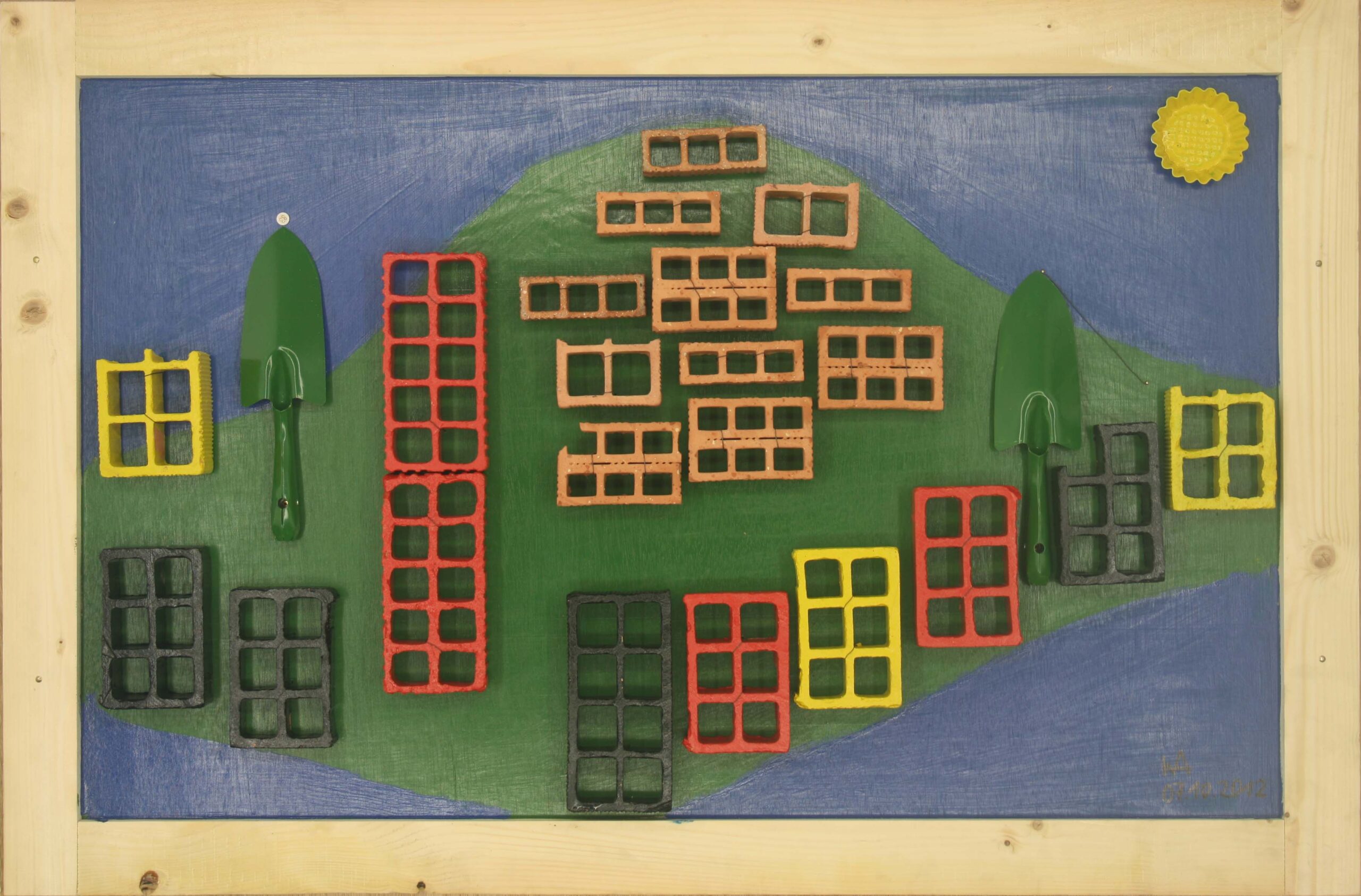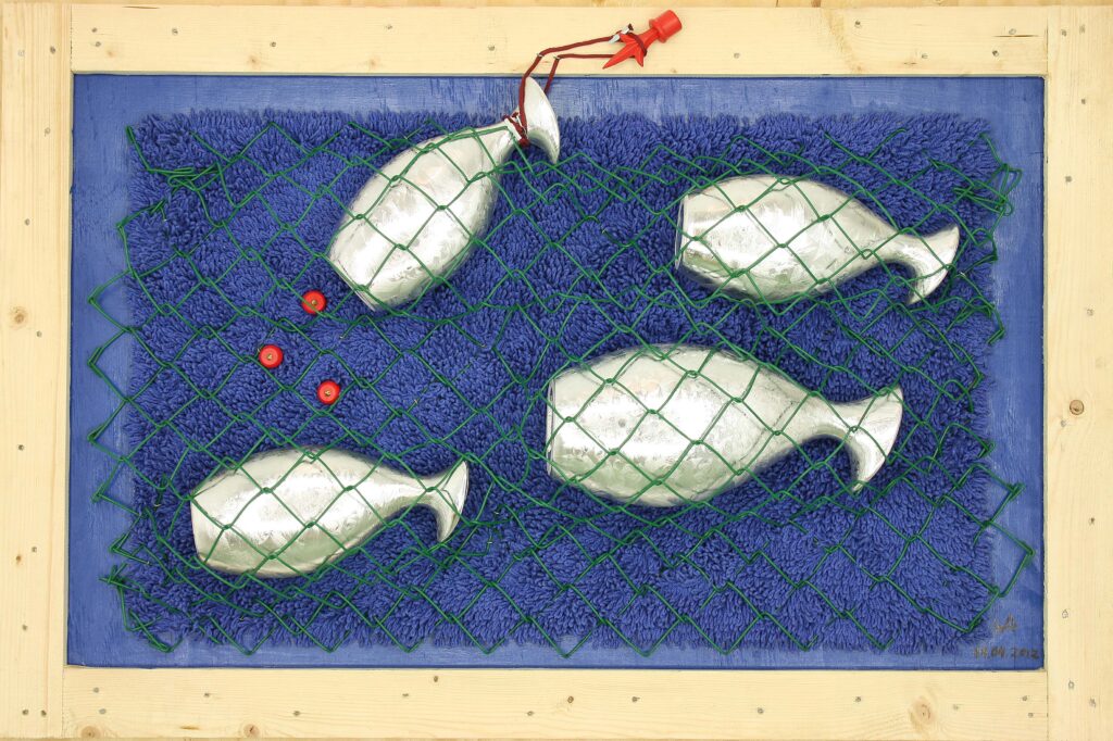 Los jarrones plateados, que ya al comprar me recordaran peces, junto con un trozo de malla metálica se convirtieron en la obra “Pesca de atunes. En una ferretería en Porto encontré 40 moldes de aluminio de los que se usan para freir cierto tipo de dulces. En mis manos se convirtieron en flores para „Florero en la ventana“, un trabajo inspirado en Marc Chagall. De las vacaciones en Brasil me traje 30 kg de ladrillos que, por su forma tan particular, resultaban muy adecuados para la representación de edificios altos. Adicionalmente hice que me cortaran en trozos de 4 cm los ladrillos en una fábrica de ladrillos al sur de Madrid. Así nacieron “Río” y “Sao Paulo” y los dos trabajos que representan el pueblo Baixa Grande situado en el Parque Nacional “Lencois Maranhenses” al norte de Brasil.