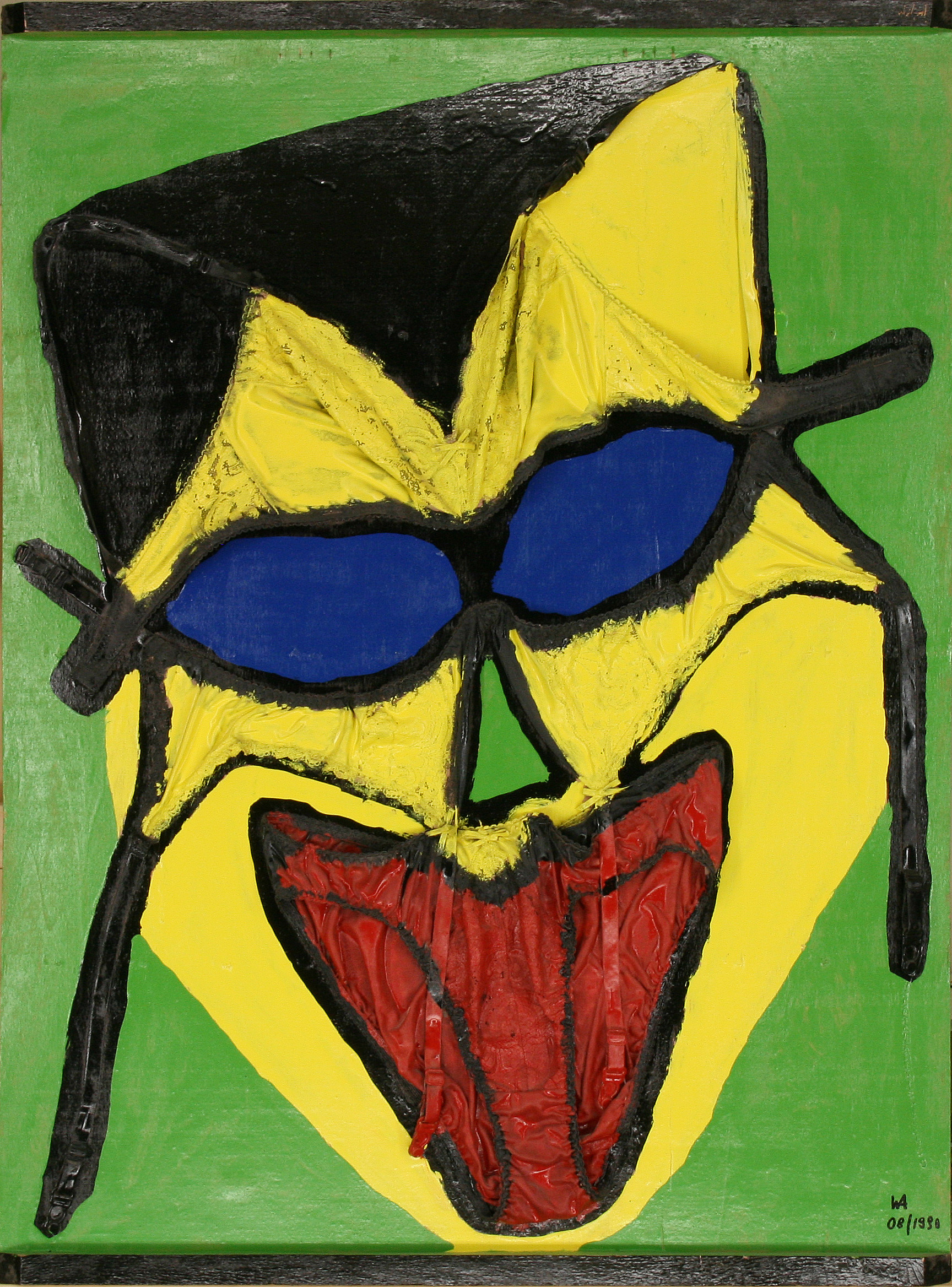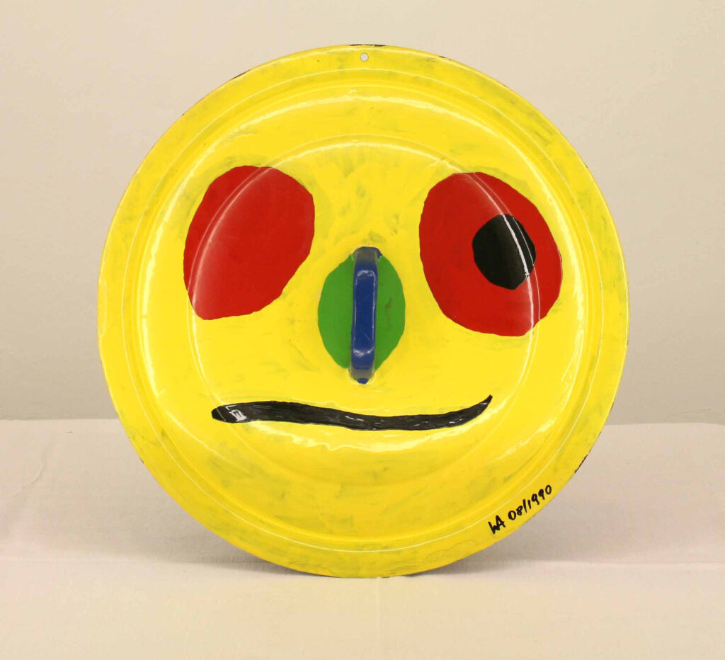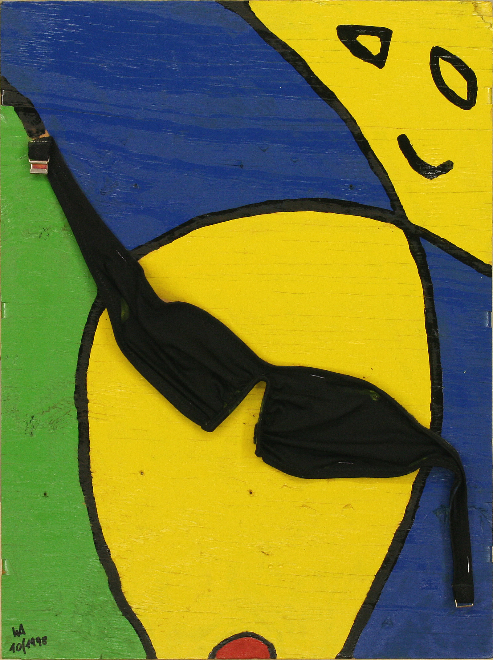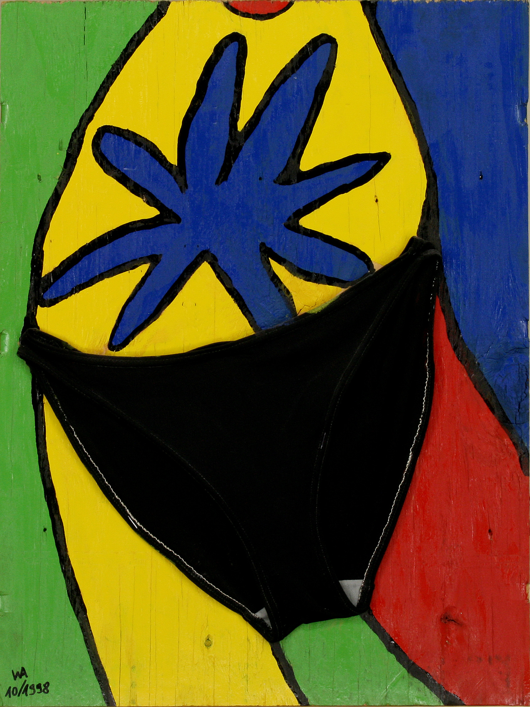 En 1986 comencé con los cuadros “Cara Vaquera” y “Cara Camisa”, una forma de pintura que consistió en grapar objetos cotidianos (en este caso ropa) a sencillas tapas de cajas de madera, pintándolas a continuación, con lacas de colores. Para ello me serví siempre de colores básicos, como había visto en Miró. Las visitas a sus museos en Barcelona y Palma de Mallorca me animaron a pintar superficies grandes y coloristas, a la vez que a no mezclar nunca los colores. En las obras “Cara riendo” y “Cara de la bailarina” utilicé ropa interior para dar la forma adecuada y añadí con las pinturas ojos azules, labios rojos y cabellos negros. La influencia de Miró queda igualmente patente en estos cuadros, que pinté con laca sobre bandejas de horno negras esmaltadas. Otro ejemplo de su influencia lo constituye el cuadro “Miró encuentra el reloj”, de 1991, en el que representé su trabajo “Personatge davant el Sol” (“Persona ante el sol”) sobre la tapa de una caja y añadí el mecanismo de un reloj en el centro del sol. Esta obra es hoy nuestro reloj de pared.