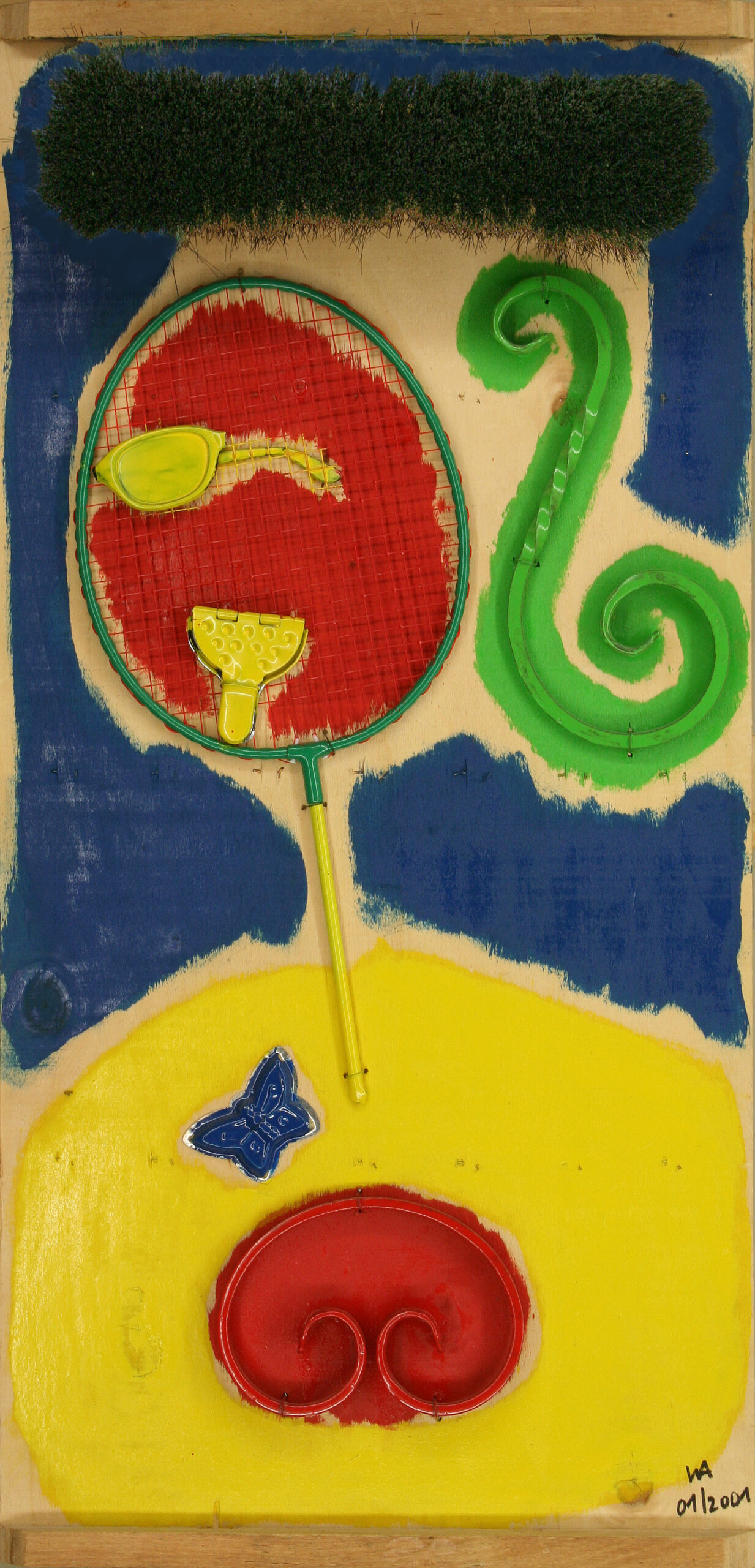 En otras ocasiones esbozo el color únicamente, mediante pinceladas sueltas. Nunca utilizo objetos de plástico, porque con el paso, del tiempo pierden la plasticidad y se rompen. La única excepción la constituyen las calas artificiales en el cuadro “Mujer con calas”. Todos los objetos están completos y no necesitan complementos. Si un objeto no representa por sí mismo lo que yo tengo por propósito, no es adecuado. El modelado ulterior con escayola, o soldado de objetos, sería contrario a mi filosofía, “dotar a los objetos de un nuevo significado”. Para fijar los objetos empleo la grapadora, o tornillos, o taladro pequeños agujeros en las tablas y fijo los objetos con finos alambres. Jamás utilizo cola o pegamento porque envejece con el tiempo y pierde sus cualidades fijadoras.