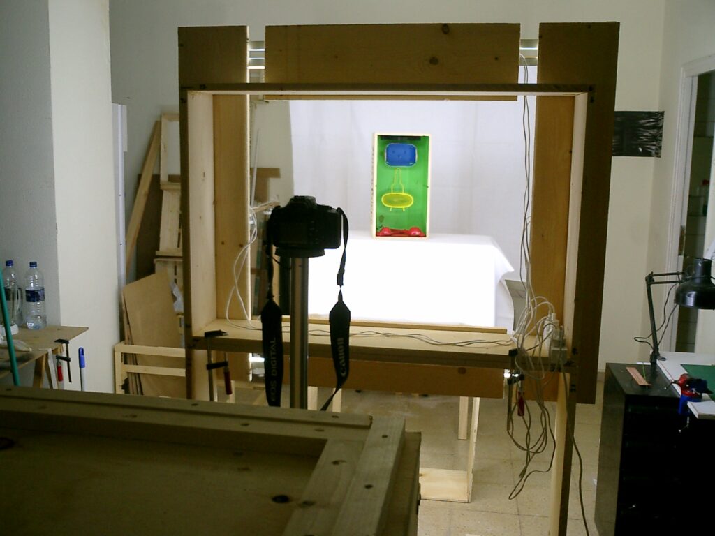 Al mismo tiempo que crecía el número de obras, aumentaba mi deseo de elaborar un catálogo. El primer catálogo fue un documento de “Word” con fotos de mis obras. Con el fin de hacer posible una iluminación uniforme, me construí un aparato móvil de iluminación que constaba de 8 tubos fluorescentes que se podían conectar y desconectar independientemente. De esta forma podía evitar reflejos indeseados en las fotos. El siguiente paso fue el desarrollo de un fotolibro. Por primera vez un verdadero libro, con tapa dura. Naturalmente imprimir un fotolibro con una tirada de 500-1000 ejemplares como catálogo es muy caro y solicité diferentes presupuestos. Mi amigo Said Messari, que realiza obras gráficas e instalaciones y ya había organizado muchas exposiciones, me apoyó con su experiencia en producción de catálogos. Así comenzamos a finales de 2007 con la preparación de un catálogo en una imprenta de Madrid. Yo llevé mis fotos y Said se encargó del diseño.