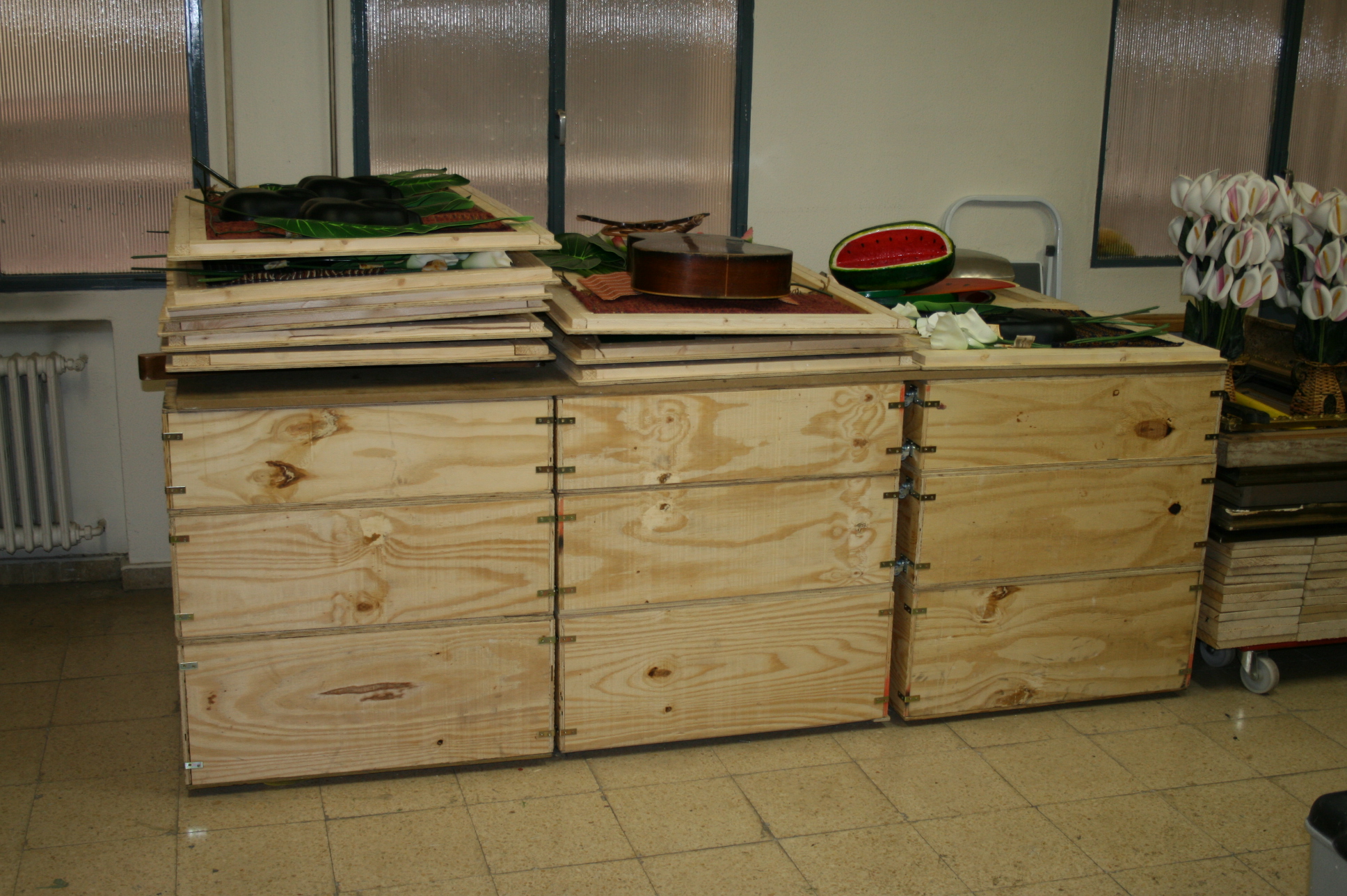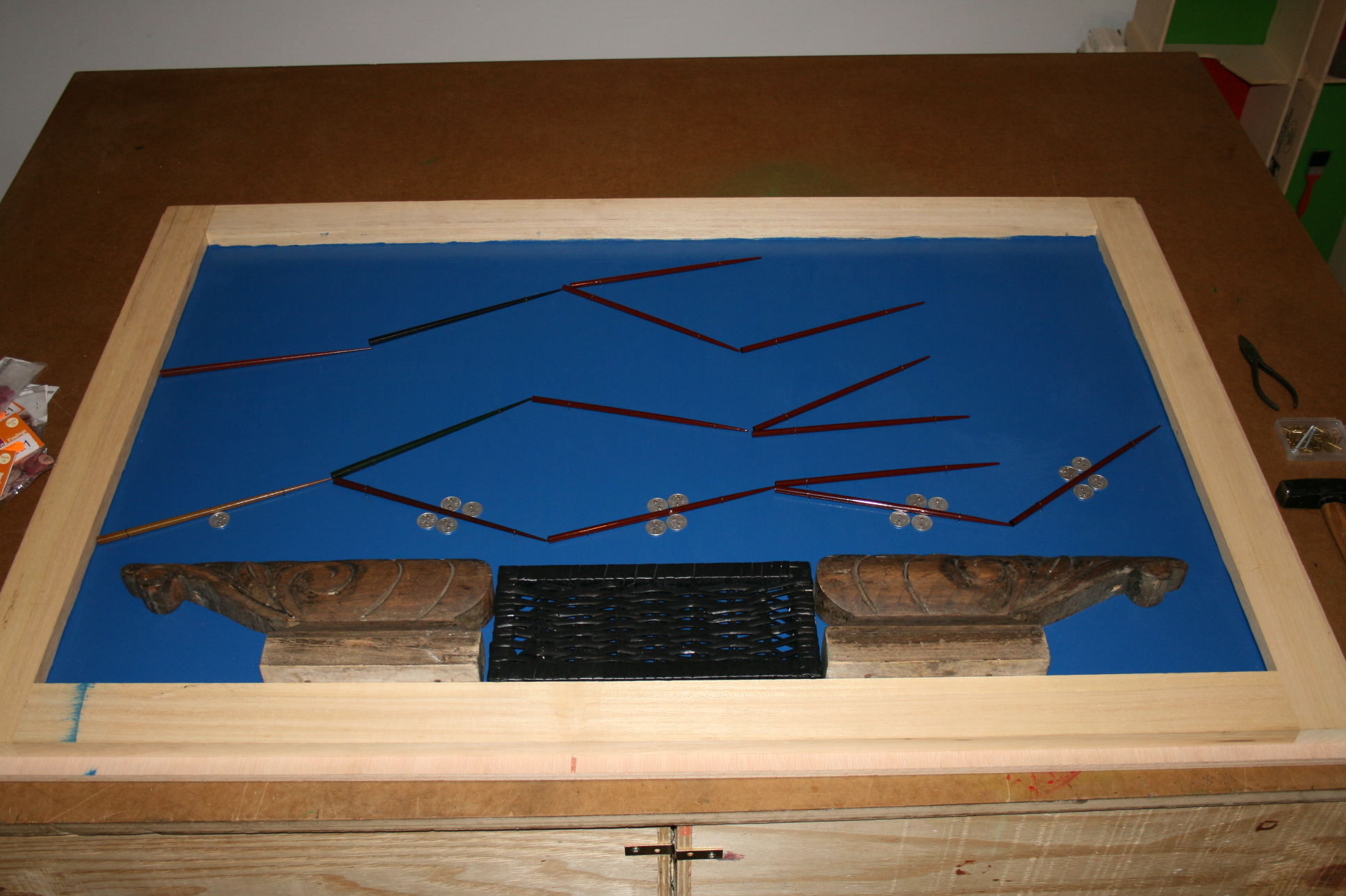 A partir del otoño de 2009 nacieron las obras con las sandías de madera compradas en México. Con un tablero de mesa encontrado en la basura y la silla de la tienda de antigüedades pude por fin llevar a cabo mi interpretación de la obra de Diego Rivera “Sandías” y con el respaldo cortado una variante de la misma. Mis impresiones del viaje a Japón en abril de 2010 quedaron plasmadas en las dos obras “Sakura (Cerezos en flor)”. Los trozos de madera, que originalmente habían sido el adorno de un armario, los palillos japoneses para comer y 250 botones de nácar, cada uno fijado con dos clavos de cobre, muestran los cerezos en flor sobre el techo de una pagoda japonesa y el cielo azul de fondo.