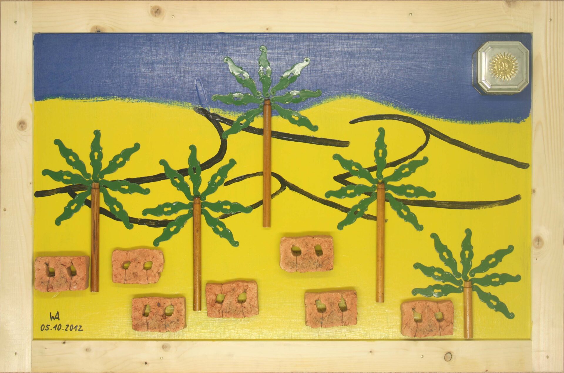 Brett, Ziegelsteine, Schlüsselblätter, Holzstäbe, Blechdose