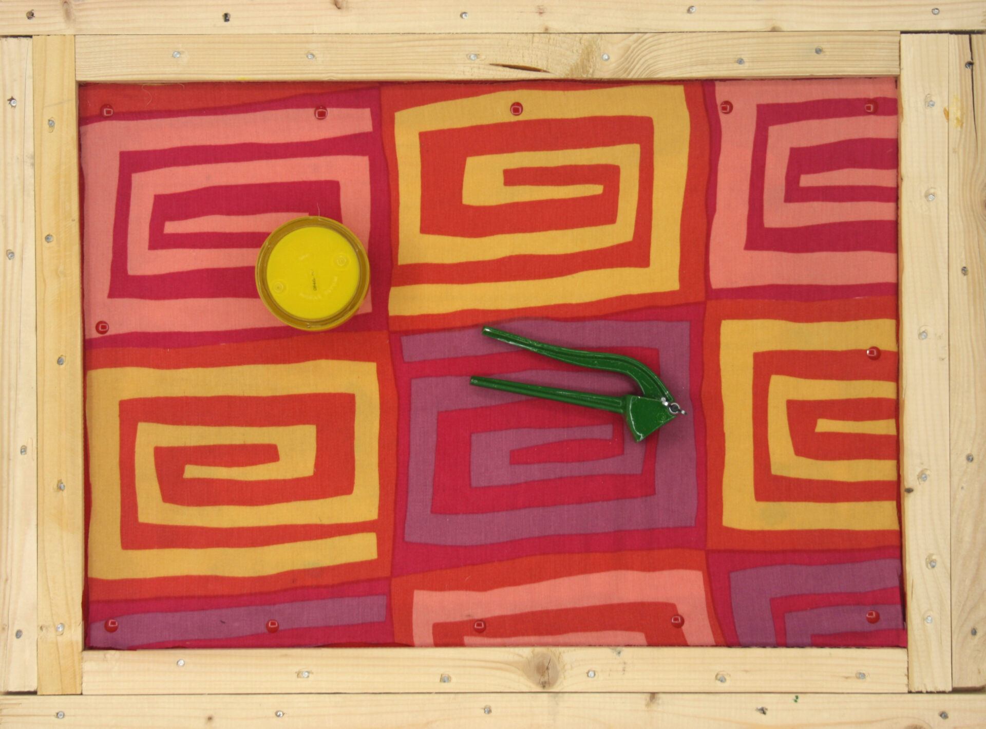 Tabla, tela, bote de crema, prensa de ajos