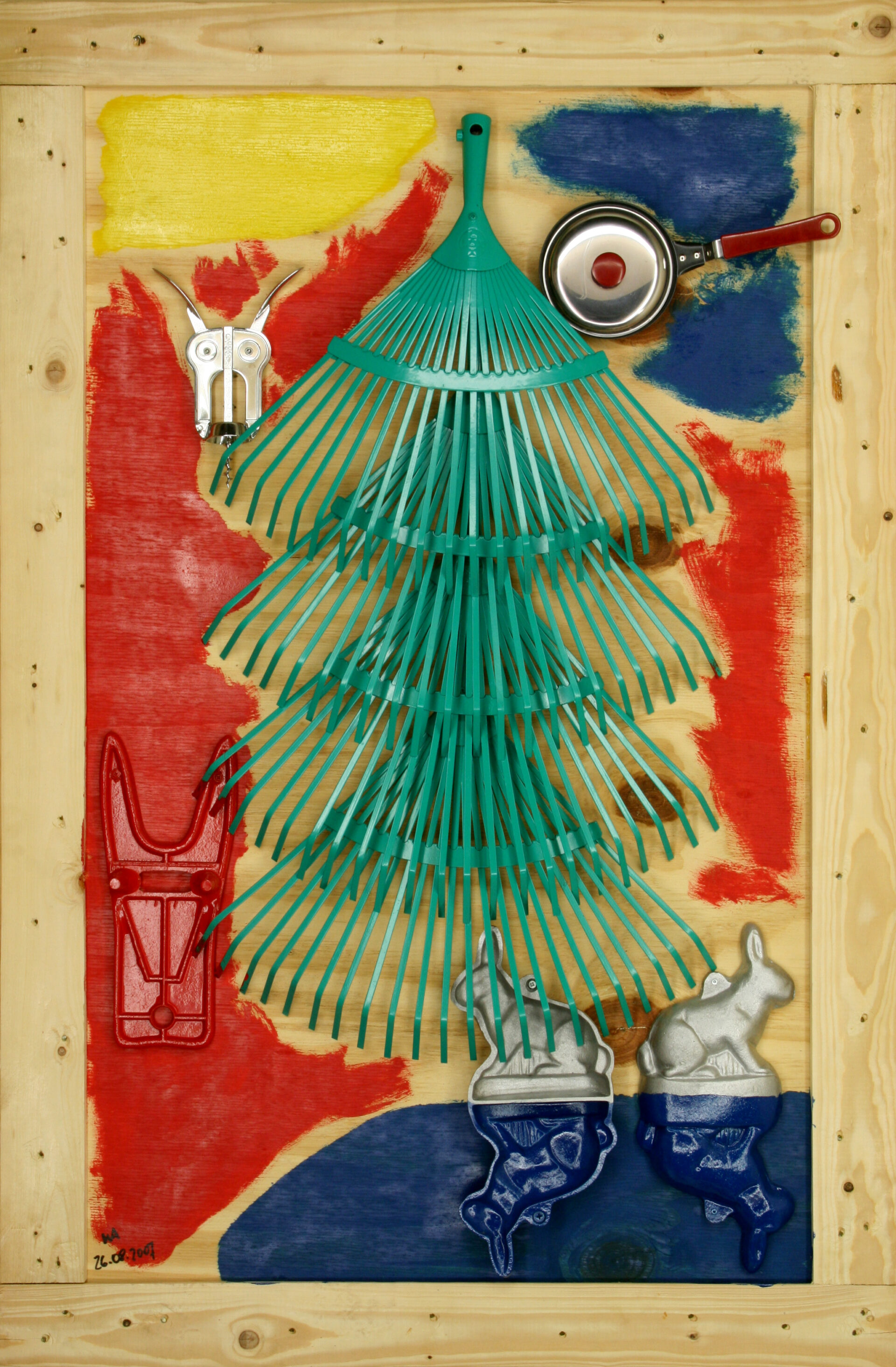 Tabla, rastrillos, sacabotas, molde de conejo, sartén, sacacorchos