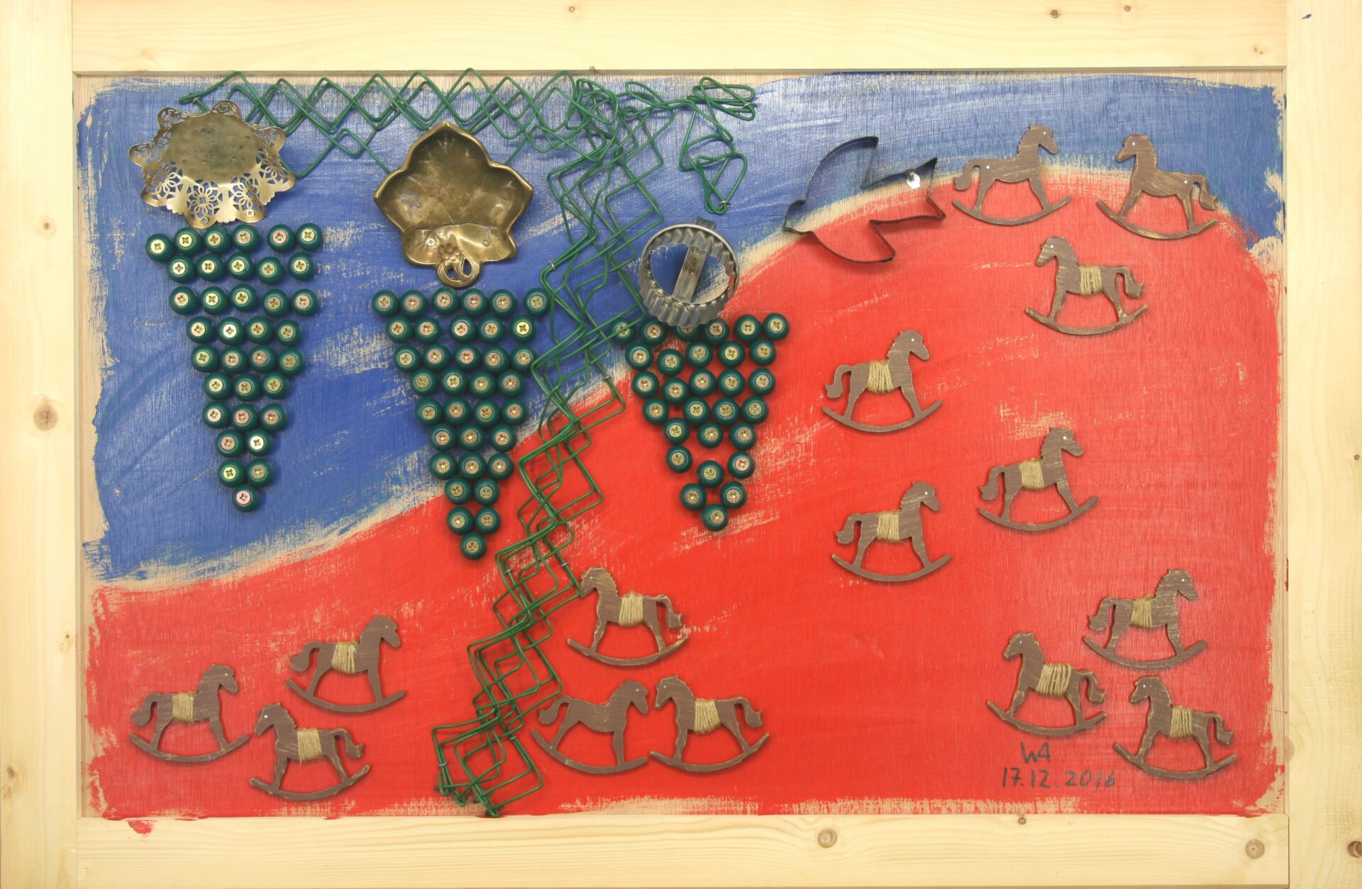 Tabla, perlas de madera, cuencos de repostería, cortadores de galletas, caballos de madera, alambrado