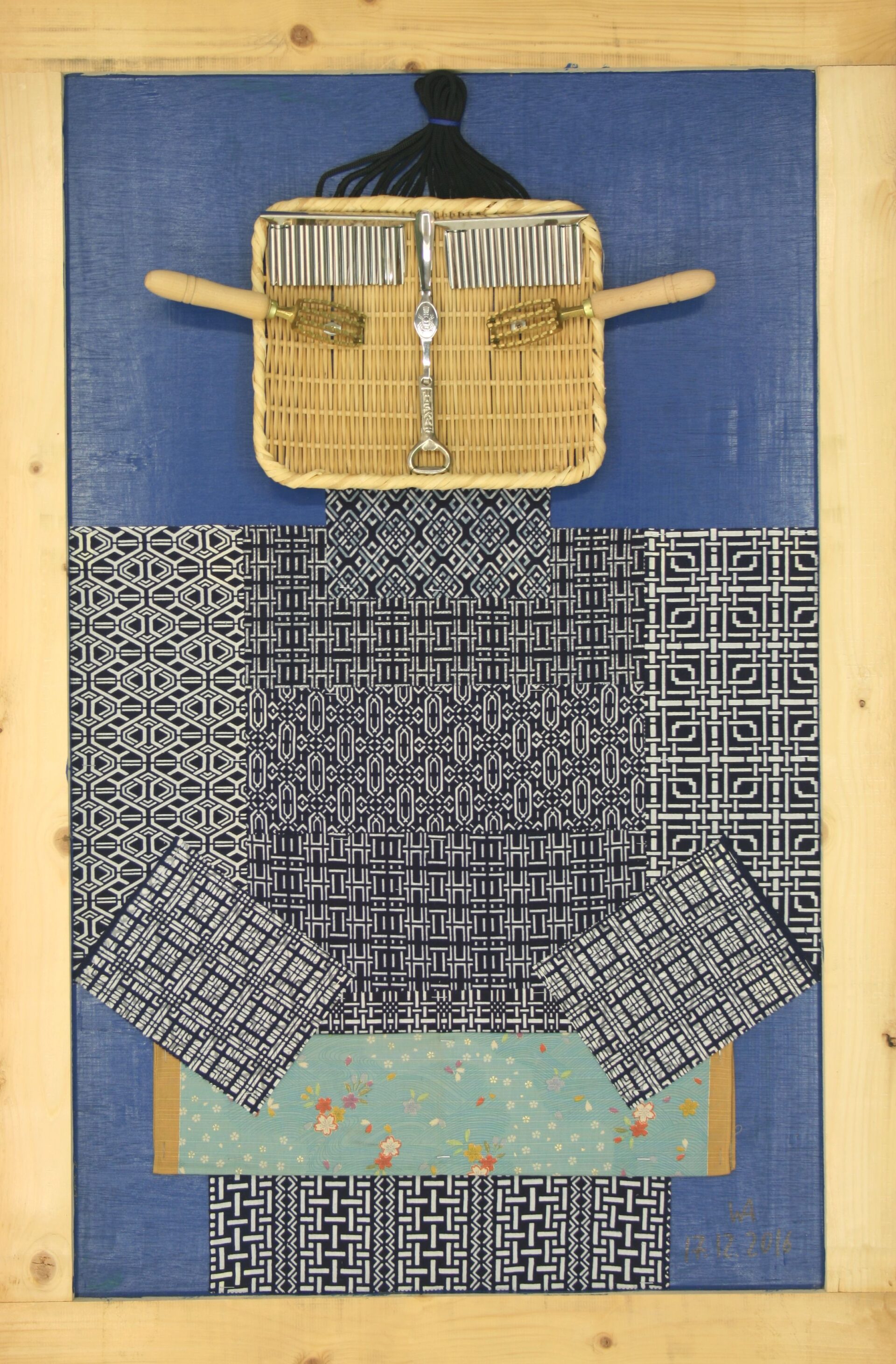 Tabla, bandeja de mimbre, descamadores, corte pasta, tenedor de bogavante, abridor de botellas, muestras de telas, mantelito