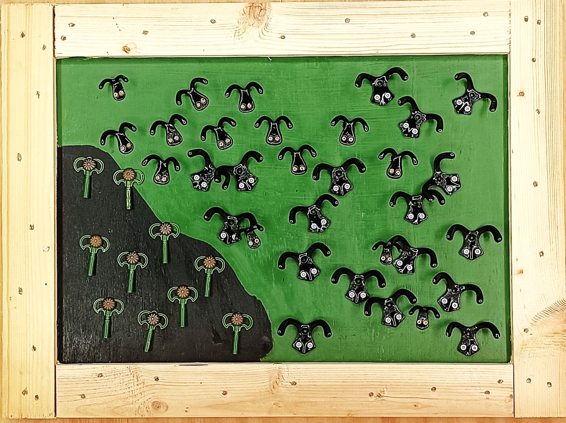 Tabla, llaves de cuerda, ganchos para bolsos