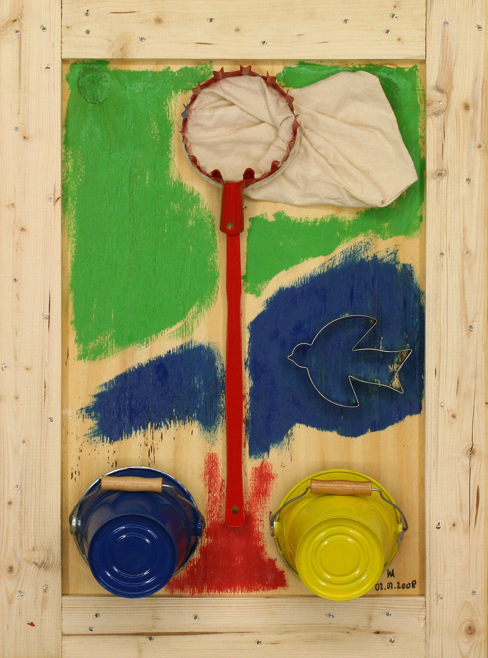 Tabla, recogedor de fruta, cubos, palo de madera, molde de galletas