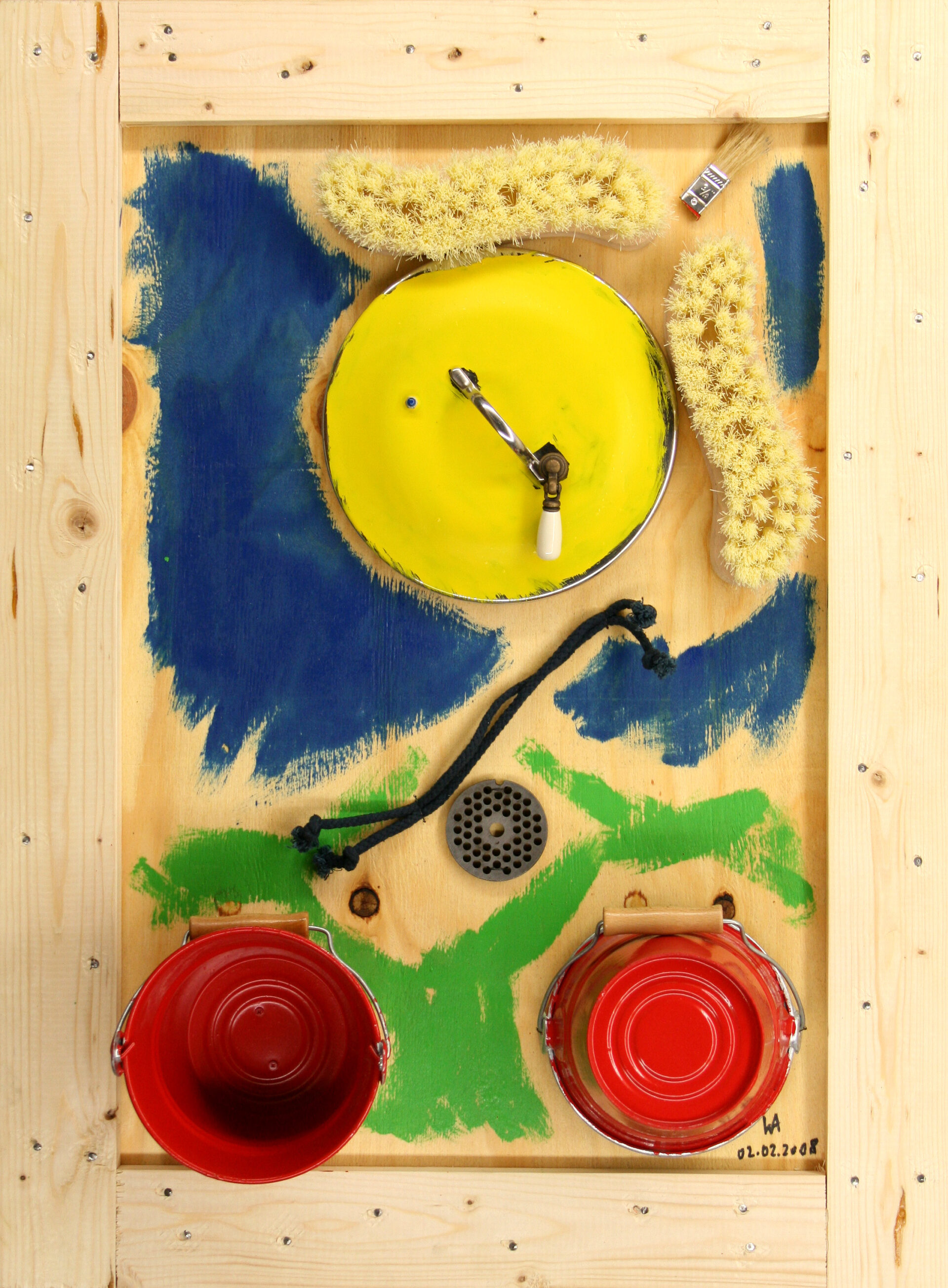 Tabla, tapa de olla, cubos, cepillos, parte de brocha, tirador, parte de picador, cuerda