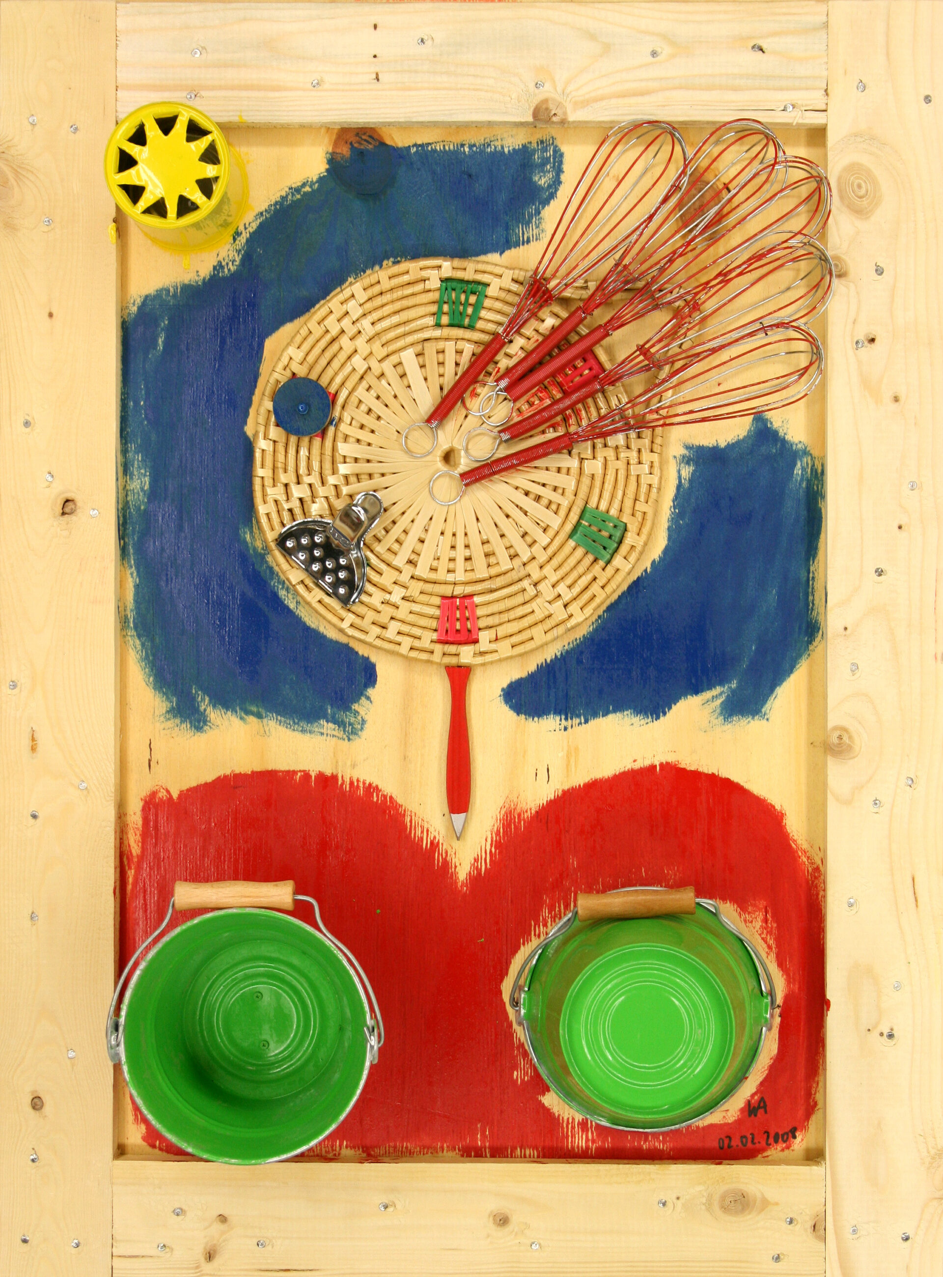 Tabla, salva mantel, batidores, lata, mango de brocha, exprimidor de limón, cubos