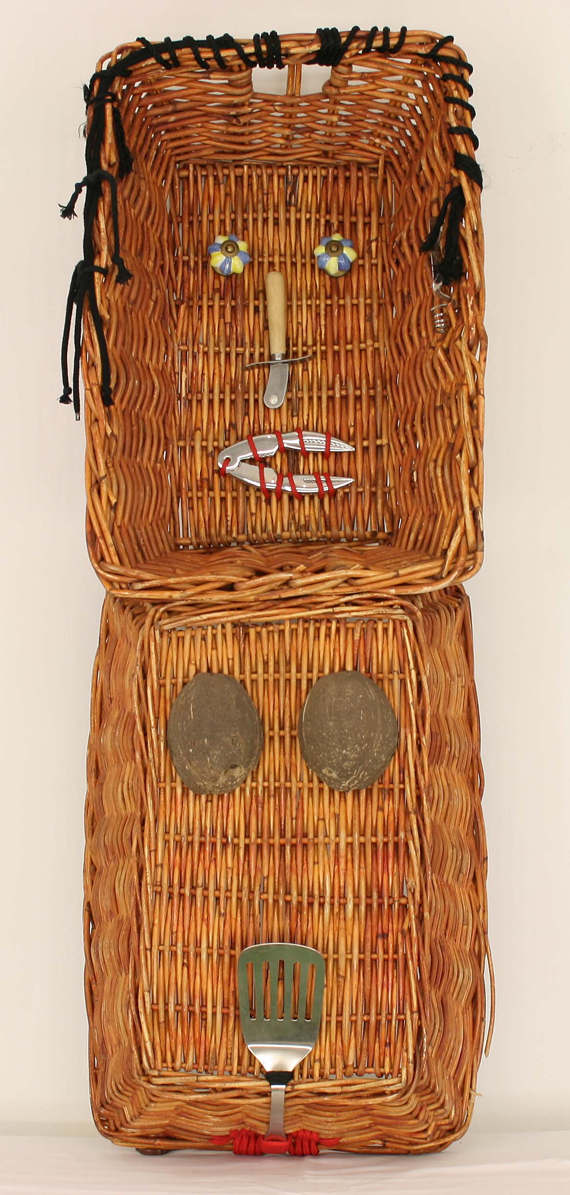 Cestas de mimbrón, cuerdas, pomos de cerámica, cuchara de miel, manubrio, tenazas de bogavante, cáscaras de coco, espátula