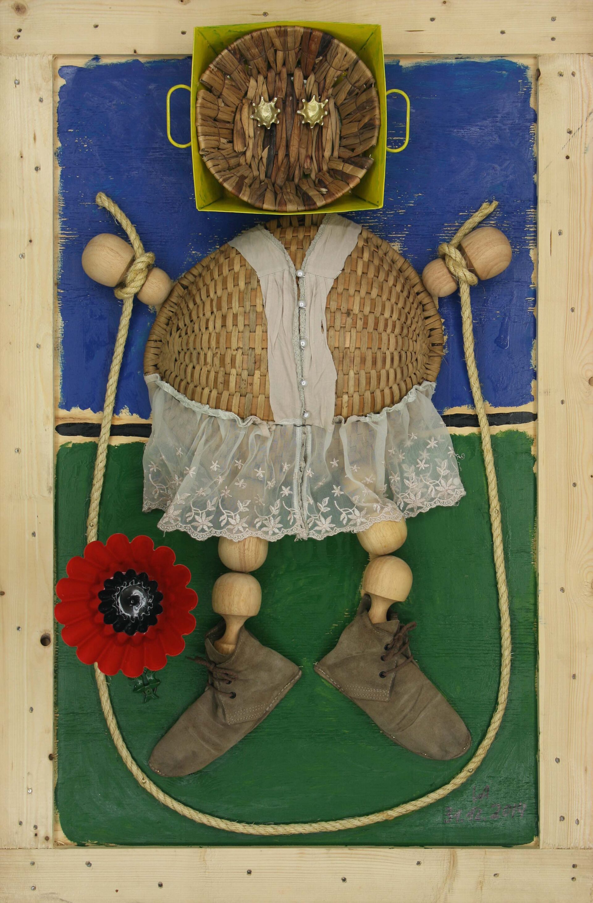 Tabla, cestita, olla de chapa, cesta de mimbre, manos de mortero, cuerda, zapatos, camisa, flaneros