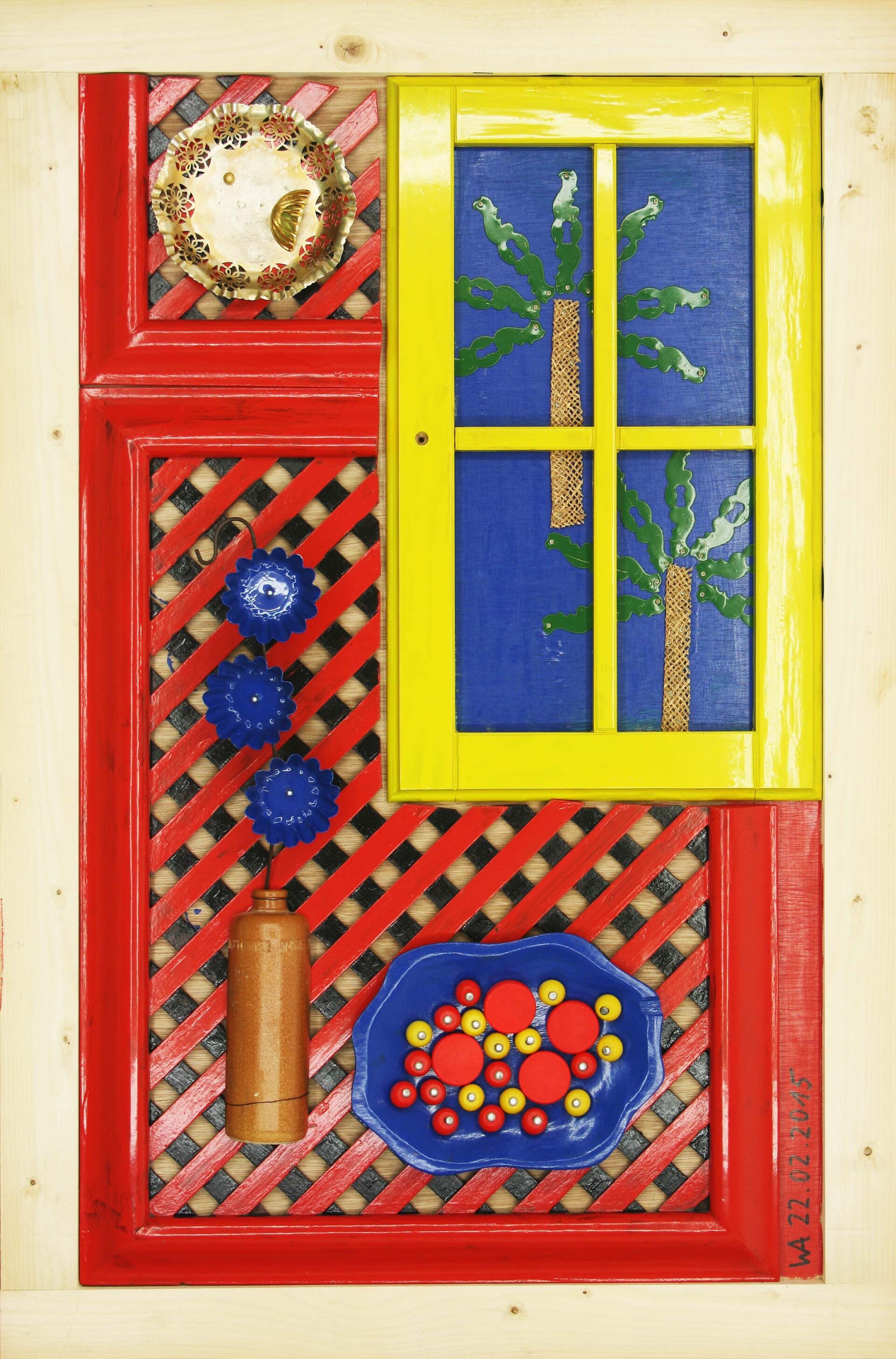 Tabla, revestimiento de madera, galletero, tirador, marco de ventana, cerraduras, trozos de rafia, botella de barro, moldes, varilla, bandeja, perlas de madera, discos de madera