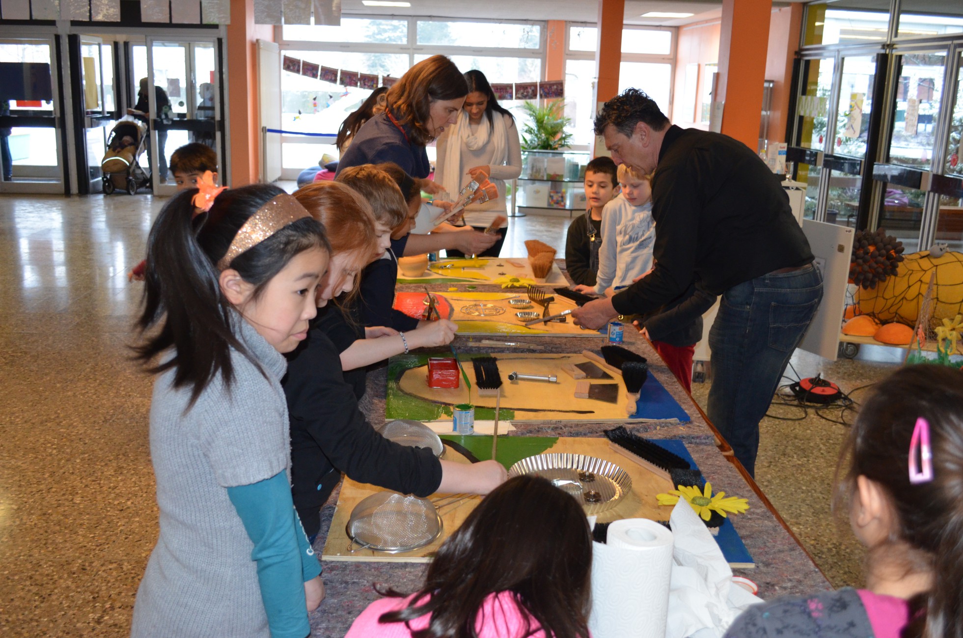 Tras una breve introducción a mi estilo artístico al que los niños ya se habían preparado anteriormente, estudiamos juntos los objetos y e hicimos una primera aproximación sobre qué íbamos a usar. A continuación los niños se afanaron en fijar los objetos a la madera con tornillos o mediante alambres finos que pasaban a través de agujeros en las planchas. Durante la última hora los niños pintaron sus obras y al final de esta artística mañana, le regalé a cada uno un catálogo firmado de mis obras