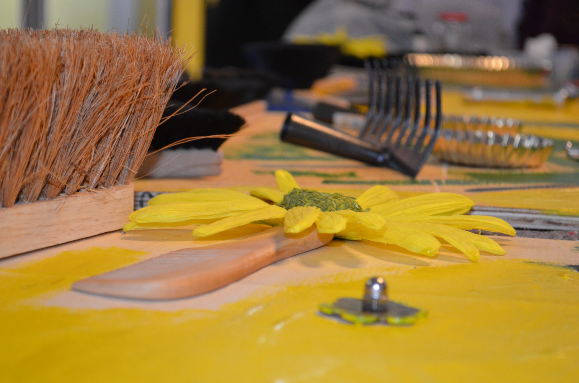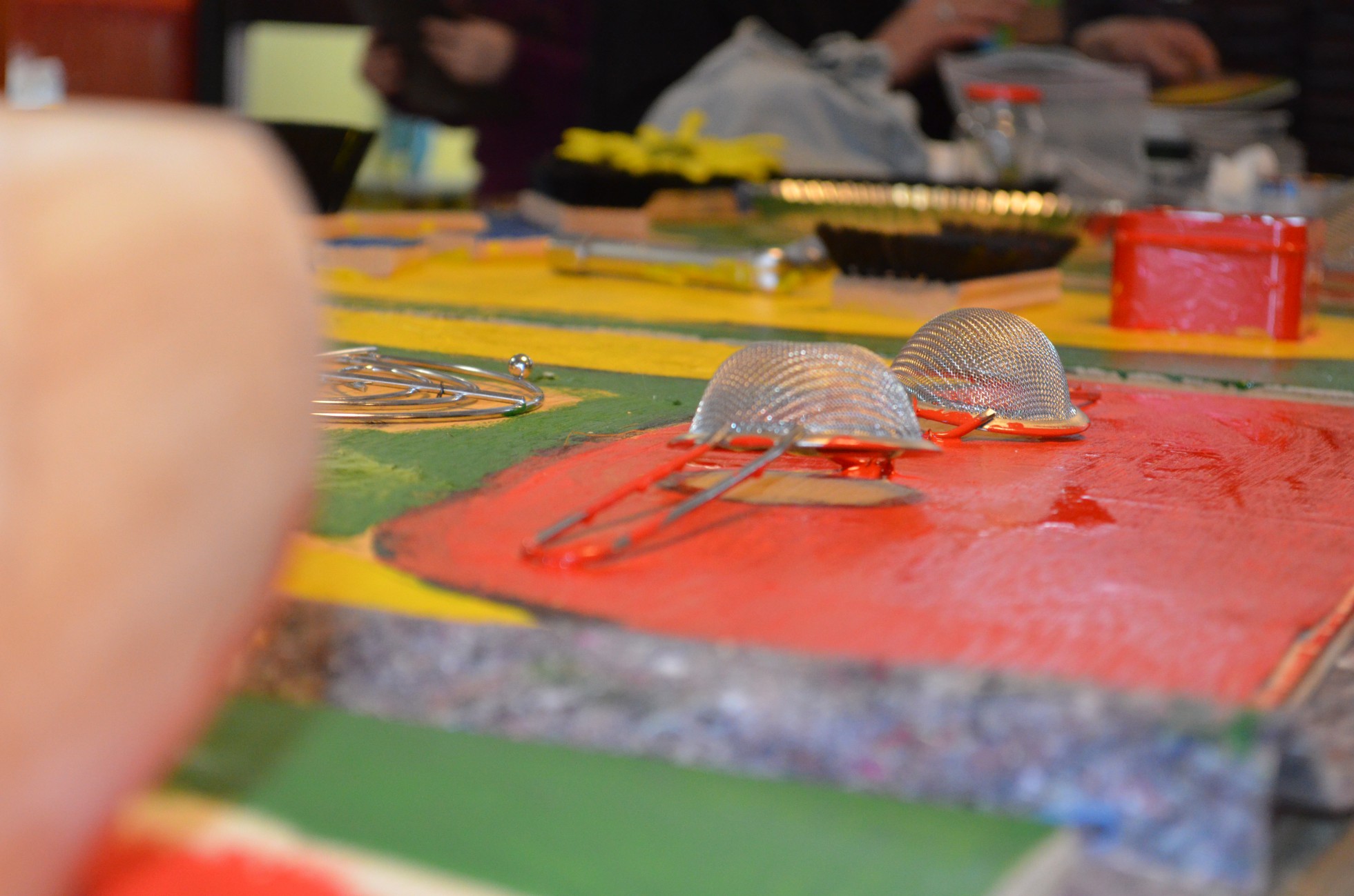 Para el desarrollo de la actividad organicé 4 grupos y cada uno crearía una obra. Dispuse 4 planchas de madera y suficiente número de objetos variados como escobas, coladores, morteros, flores de papel, moldes de cocina, etc. para crear obras de arte.
